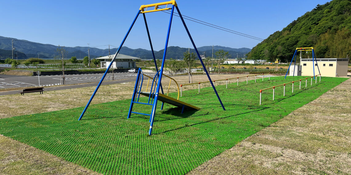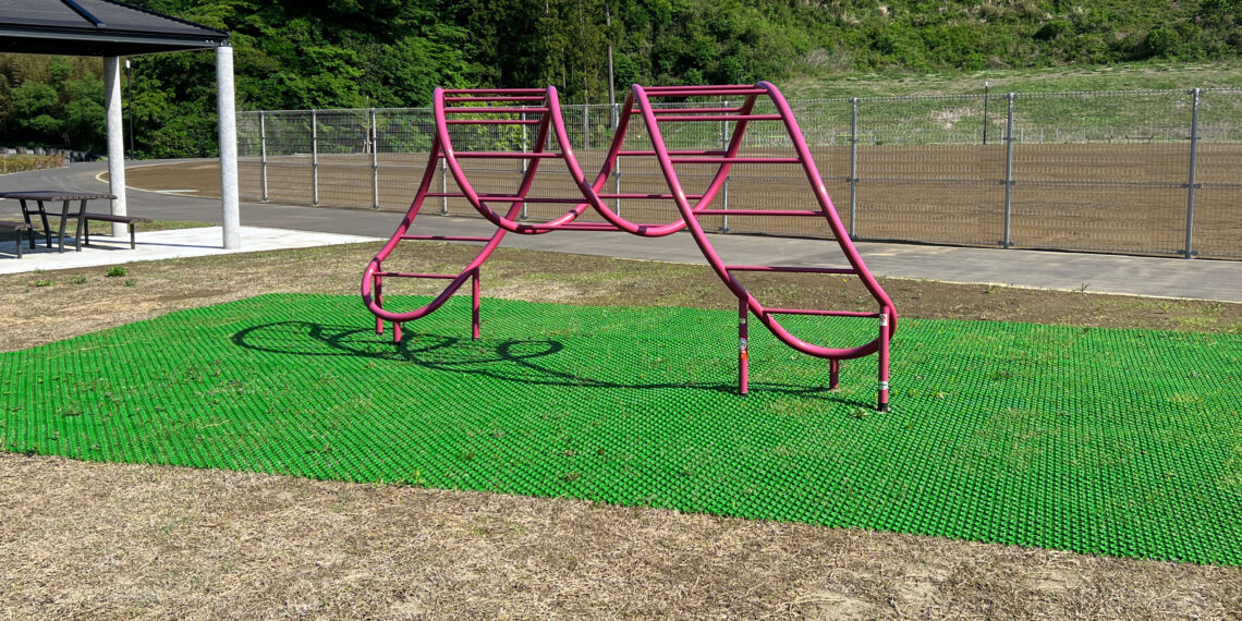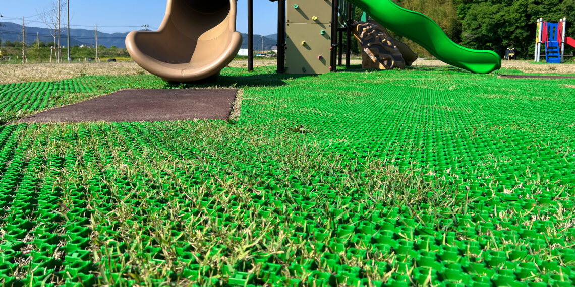 石巻市の新設公園でご使用いただきました。 芝生の負担軽減を目的で遊具周りに使っていただきました。 こちらのように広大な面積の場合には、部分的にローンガードナーをご使用いただくととても効果があります。