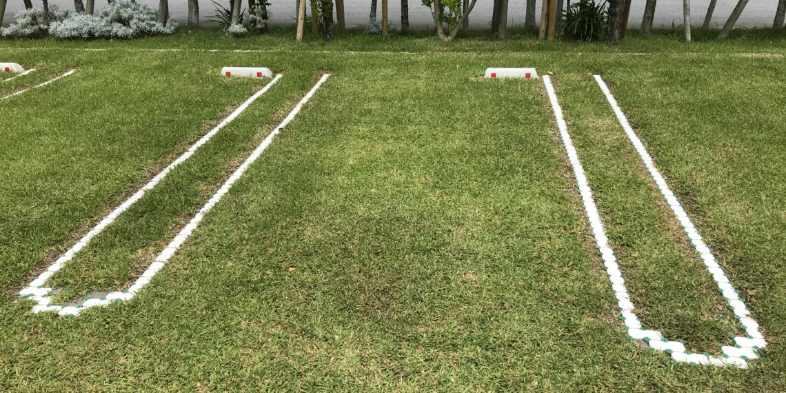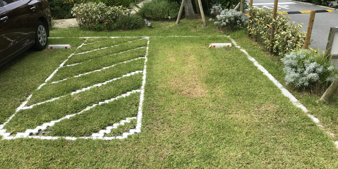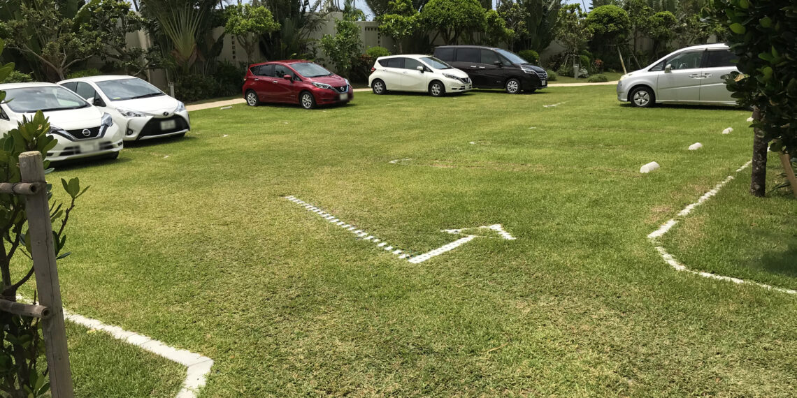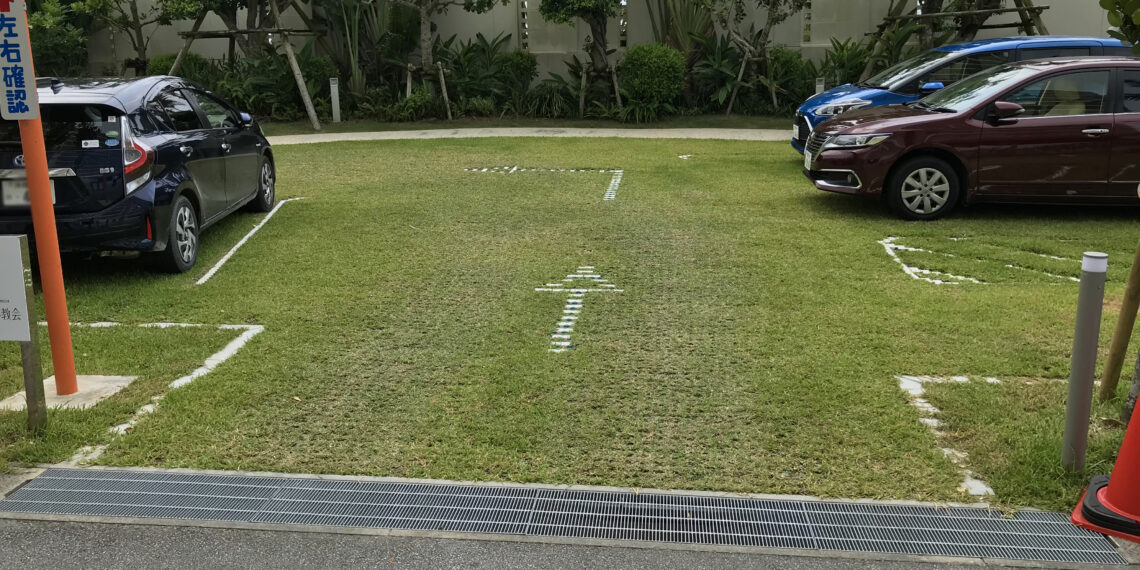 沖縄県の宿泊施設にローンベースをご使用いただきました。 副資材のローンマーカーを矢印型に設置して、順路を分かりやすく表しております。 この他にも「軽」や「車椅子のマーク」など、様々な標示を柔軟に作ることができます。