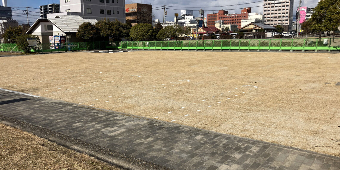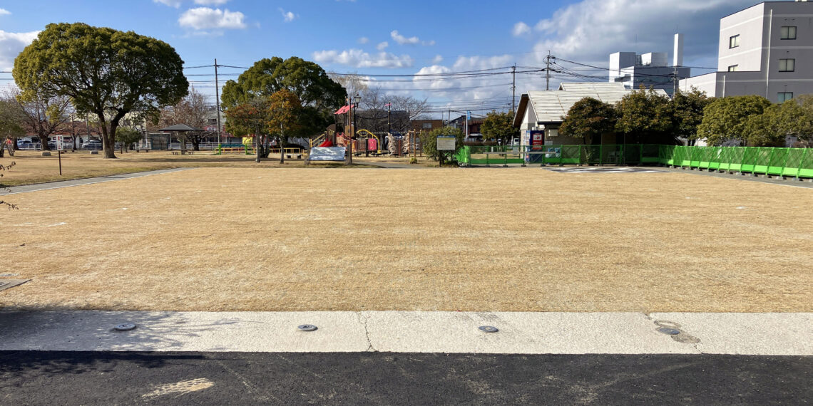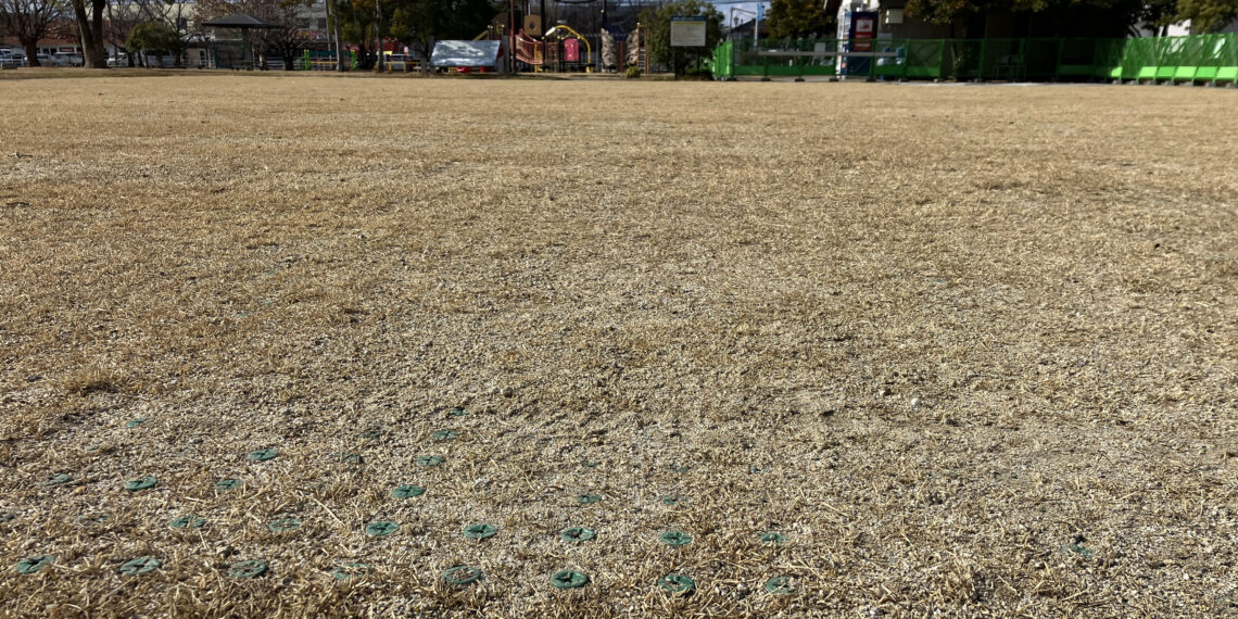大分県の公園にローンベースをご使用いただきました。 写真の通り、一見すると美しい芝生広場ですが、内部にローンベースを敷設しています。 表面の突起がタイヤを受け止めることで、芝生の根を傷つけることなく車両の乗り入れを可能にしています。